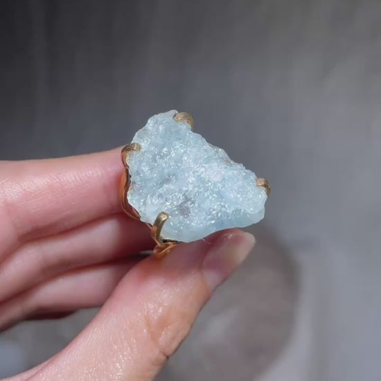18K gold or 925 Silver pleated bronze adjustable ring, features Aquamarine raw stone. Mined and mounted in Brazil