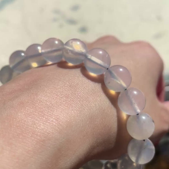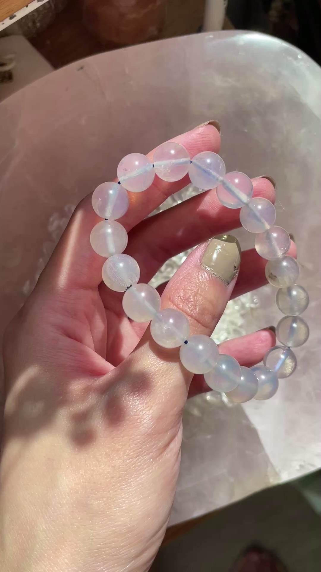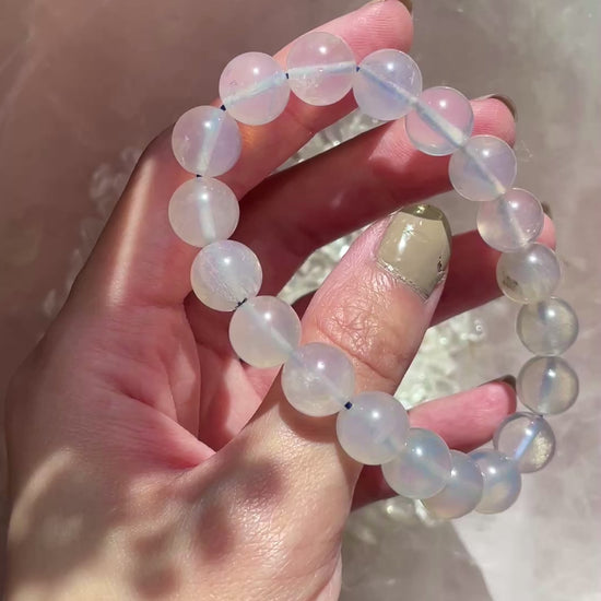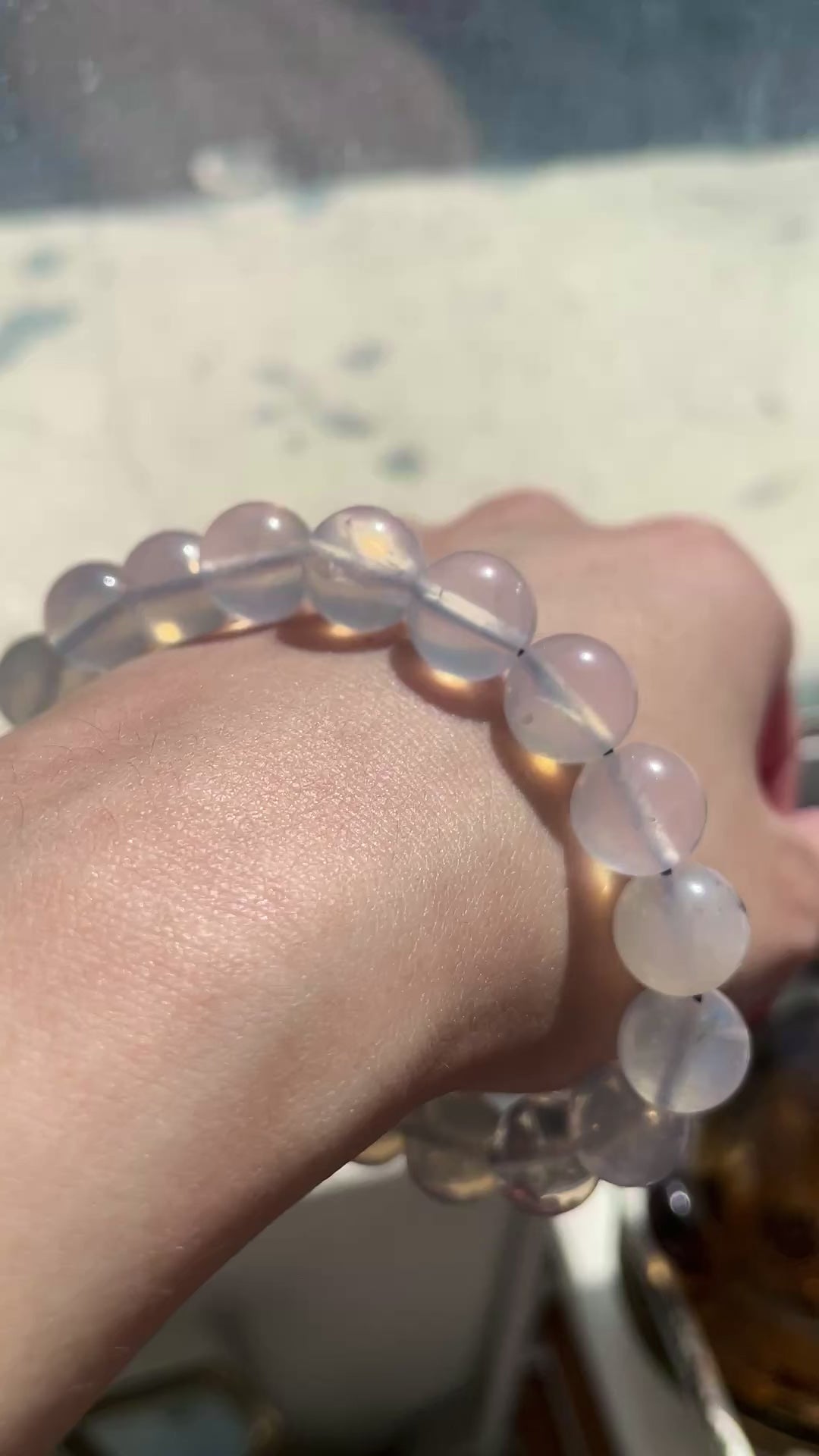 Blue roses are a symbol in alchemy as something that is impossible because it doesn’t happen in nature. It is also a religious symbol of Mother Mary. Blue Rose Quartz is a type of in-between Girasol and Rose Quartz that does actually have a blue hue to it in some light, pink in others, and when you hold it up to the light, gives a golden glow.