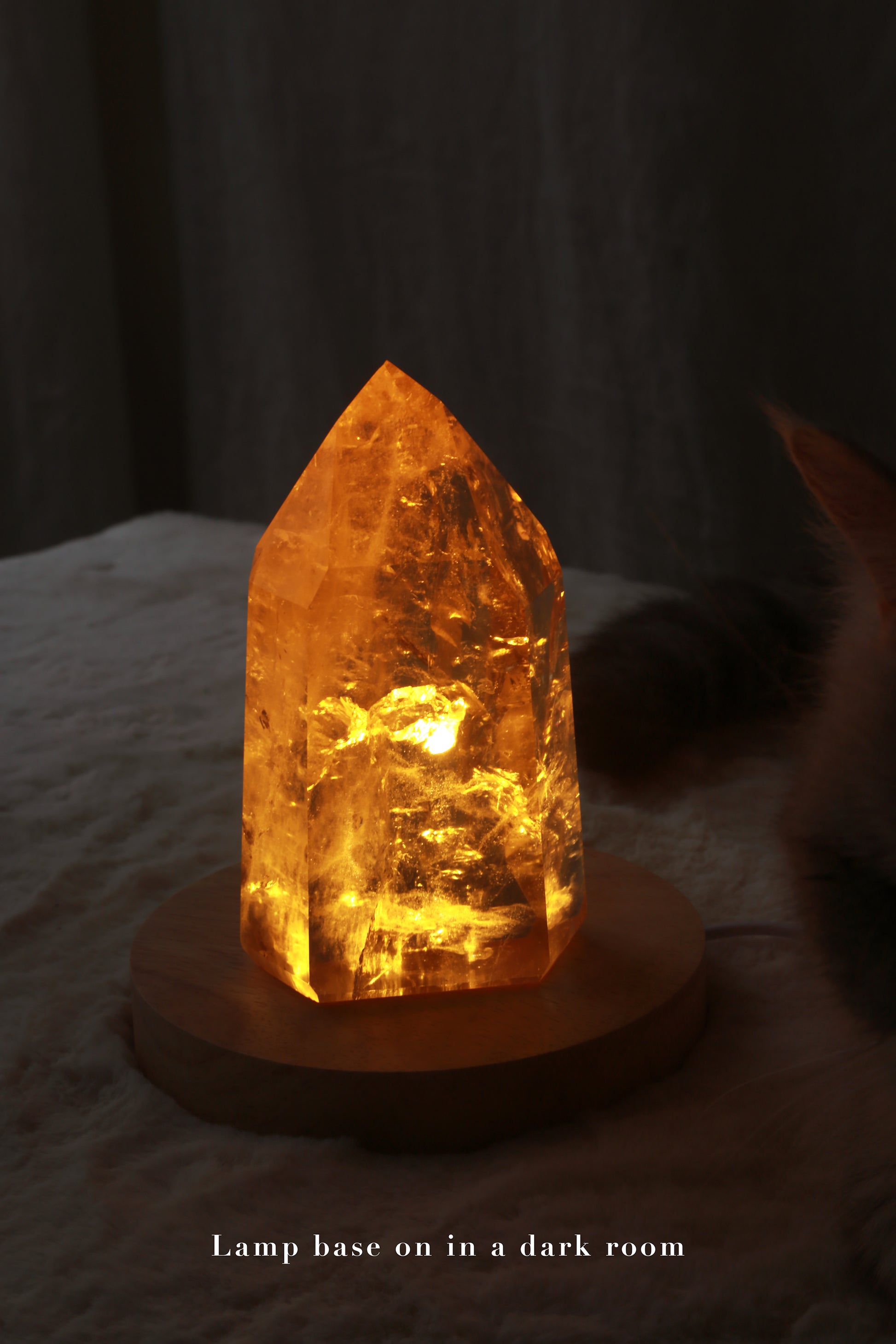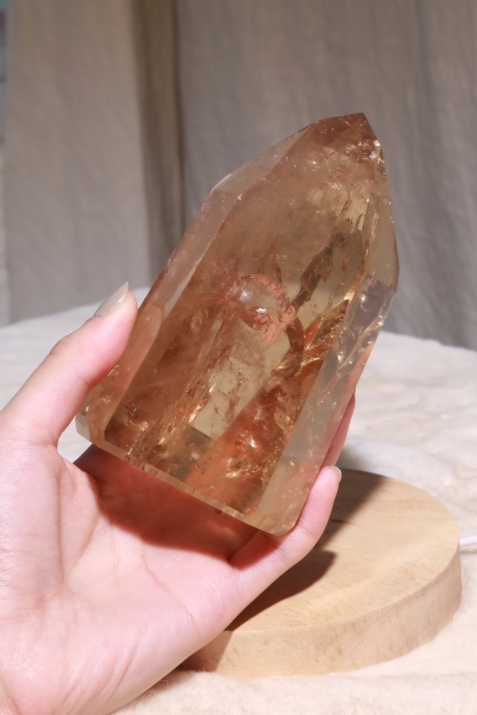 Directly from Brazil, a natural, undyed, and not heat-treated Citrine tower. High quality Whiskey colour with great clarity and rainbows, comes wiith a wooden LED light base (12cm diameter), USB cable charge.