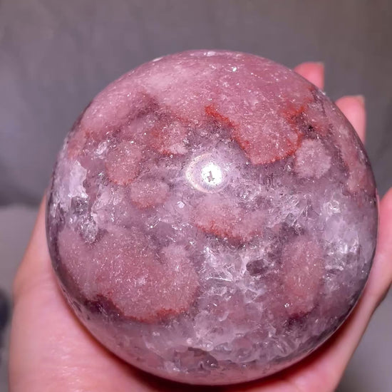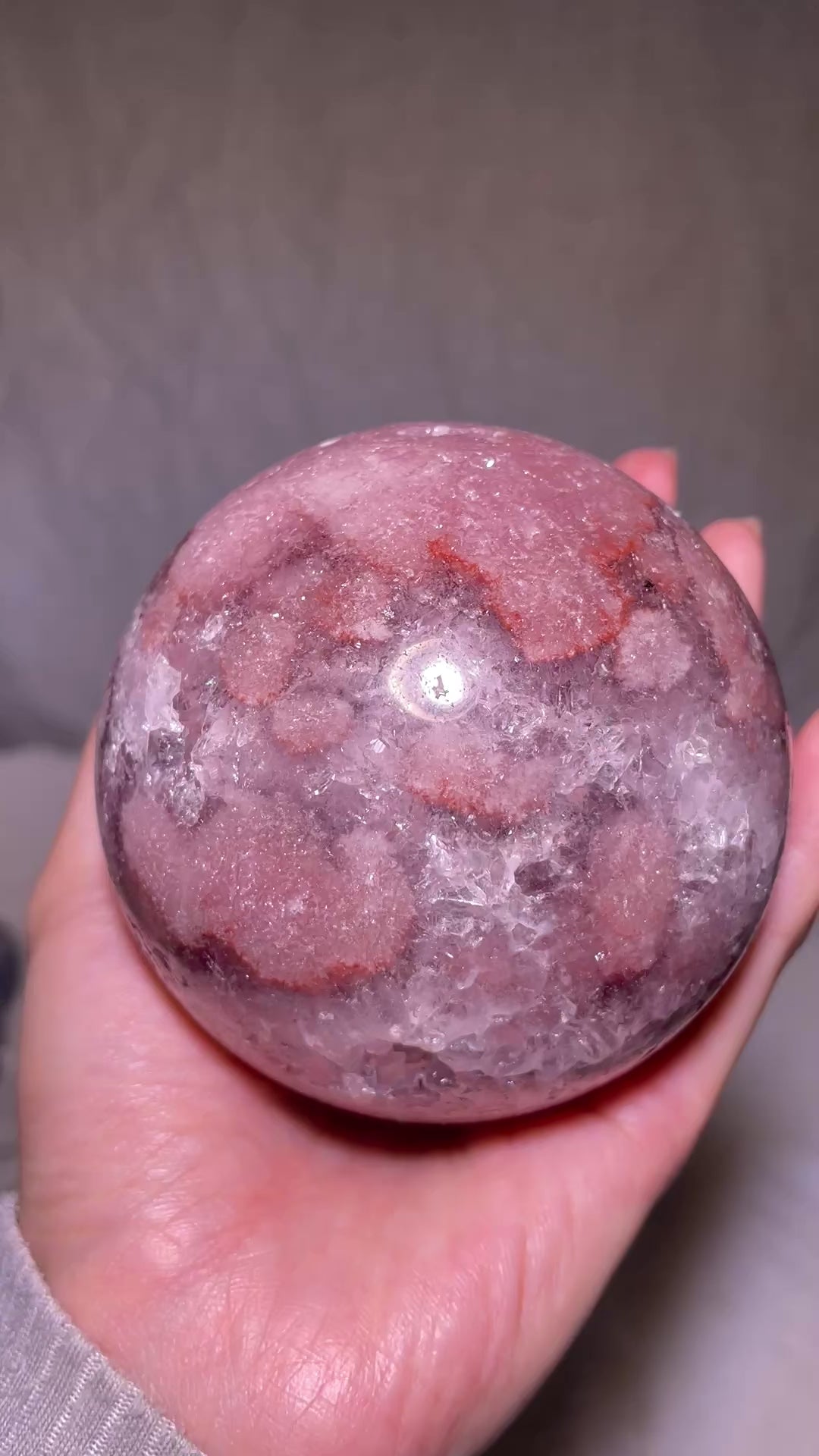 85mm Pink Amethyst Sphere with purple druzy amethyst inclusions.
