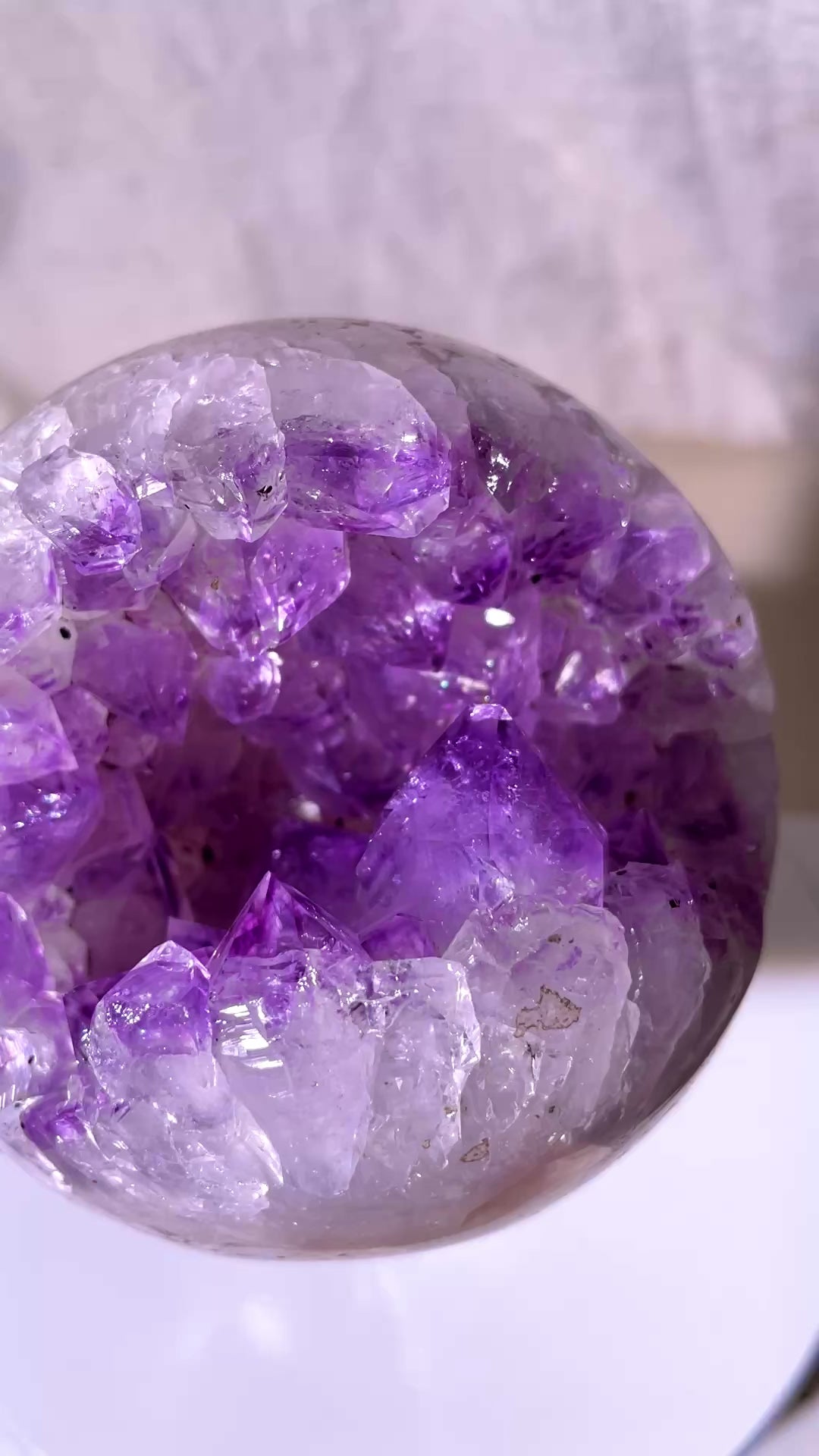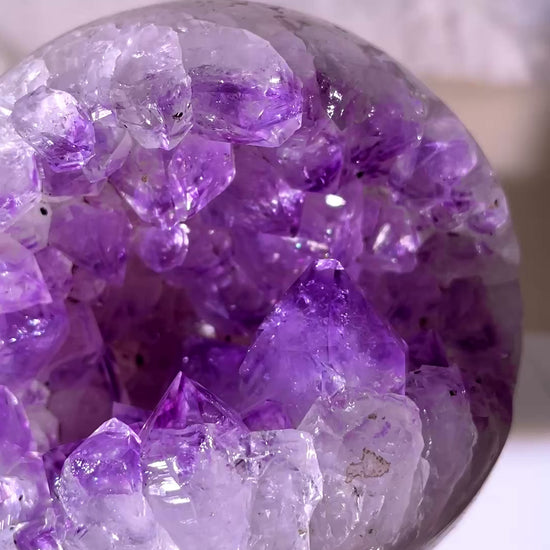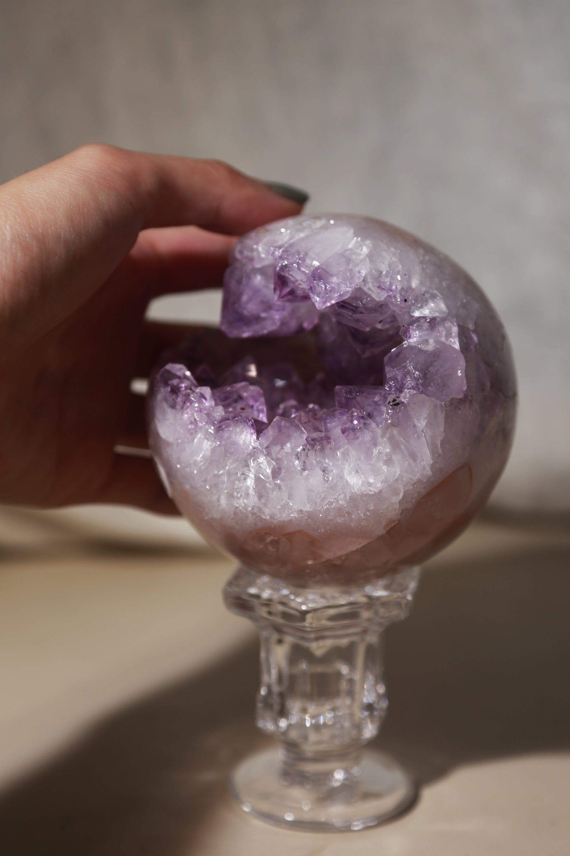A beautiful Large Rainbow Amethyst Sphere with lovely Pink Quartz inclusions and a purple phantom druzy open cave.