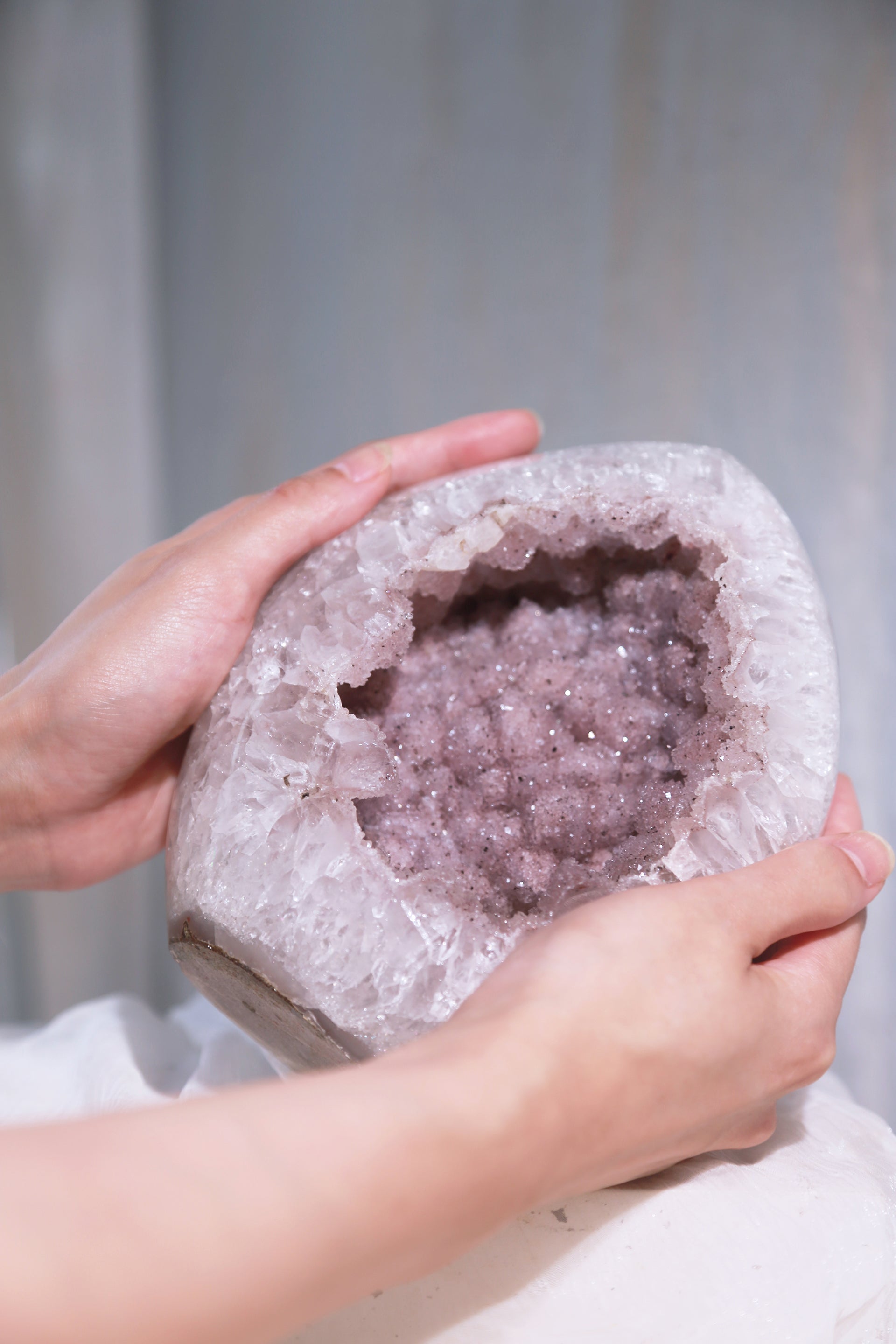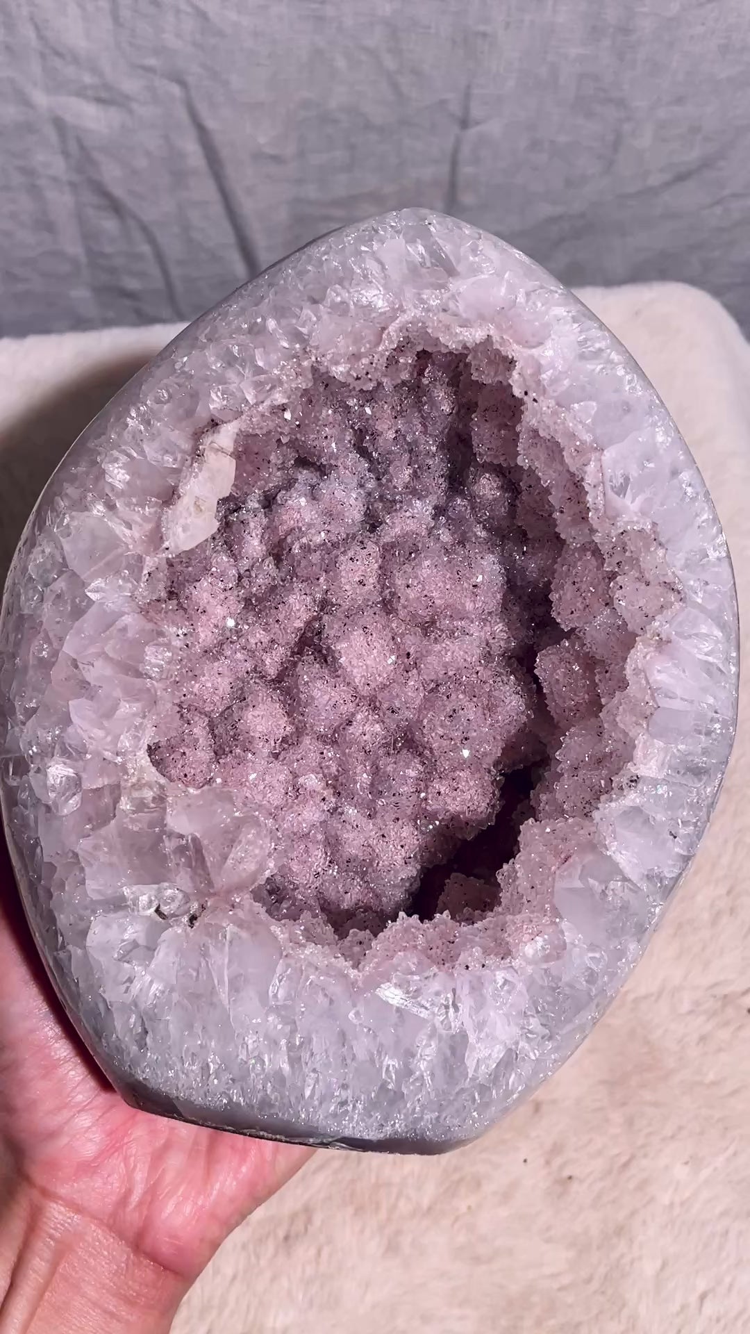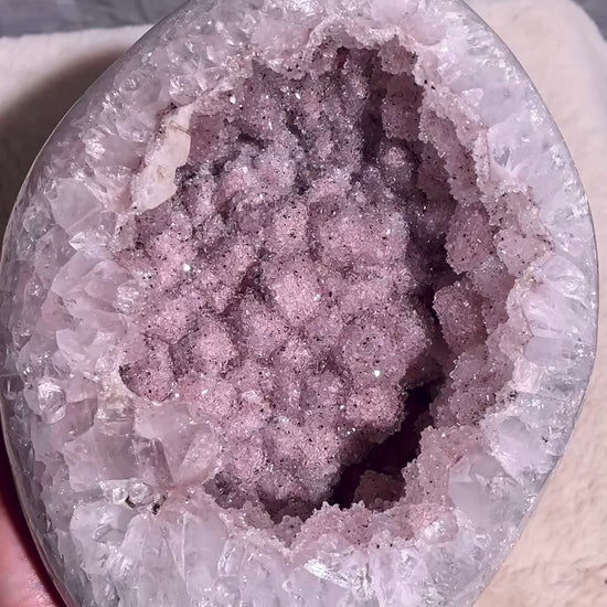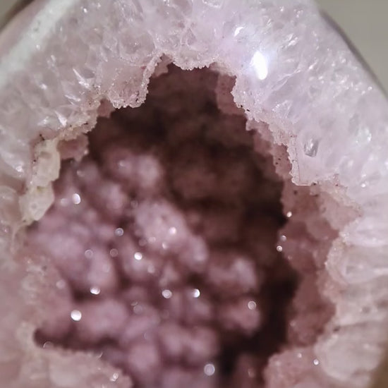 A beautiful Large Rainbow Amethyst Polished freeform, features a really sparkly pink sugar druzy geode. "Sugar druzy" is a descriptive term for a type of druzy (a layer of tiny, glittering crystals on a rock surface) where the crystals are very fine and resemble grains of sugar. Its formation is a secondary process in which mineral-rich water seeps into cavities or cracks in a host rock, and the subsequent evaporation or cooling of this water leaves behind the microscopic crystals.