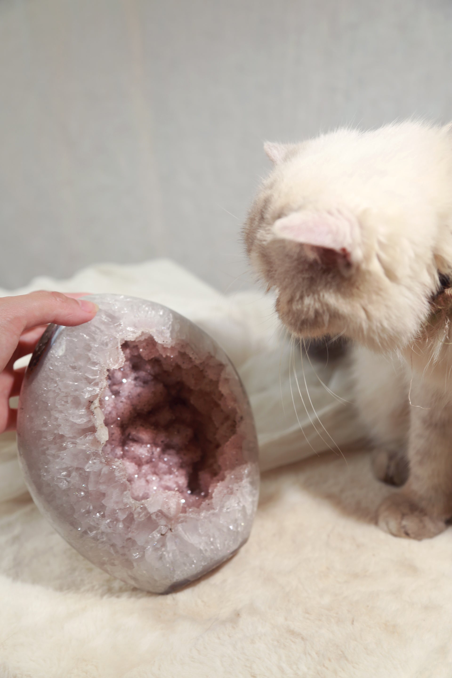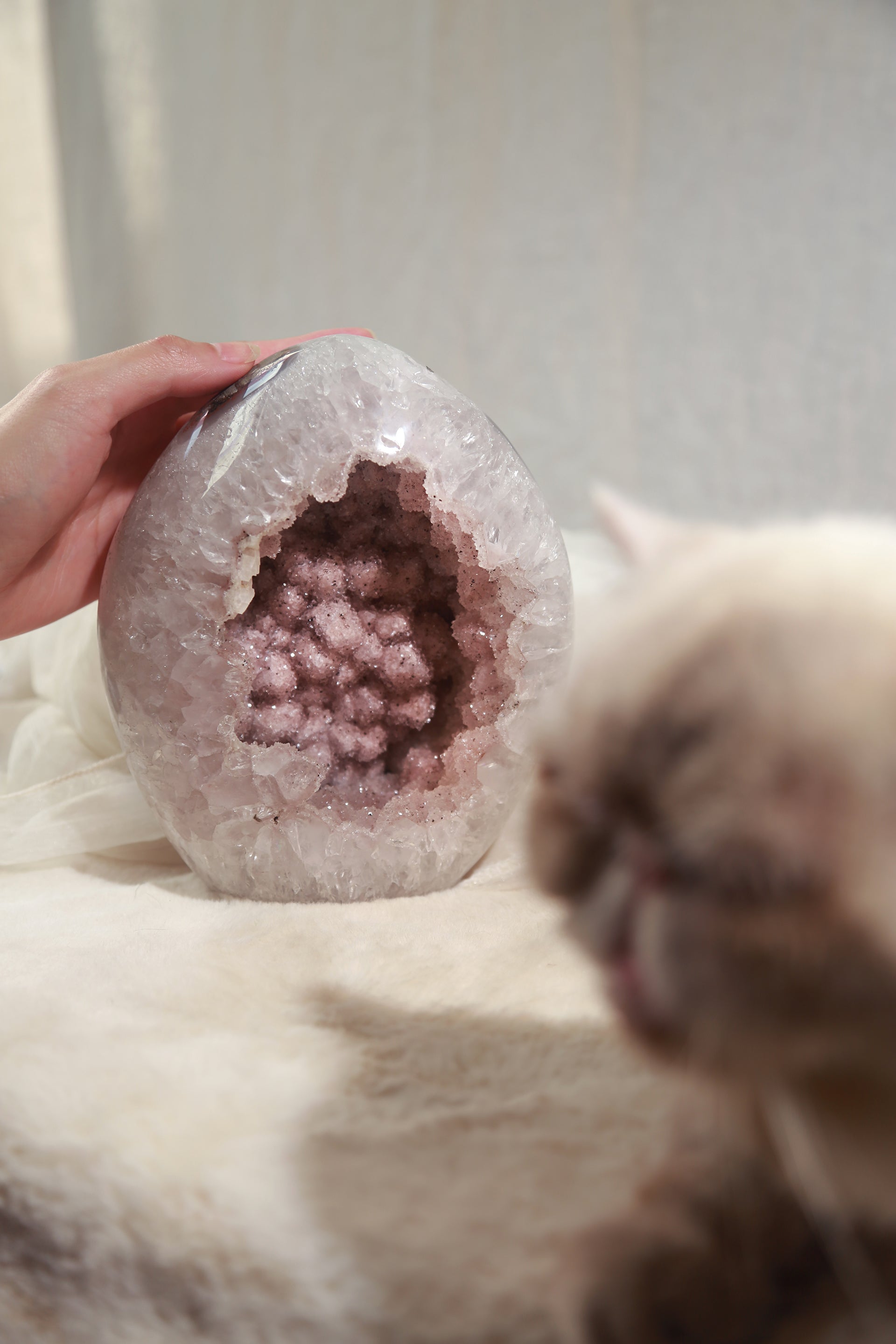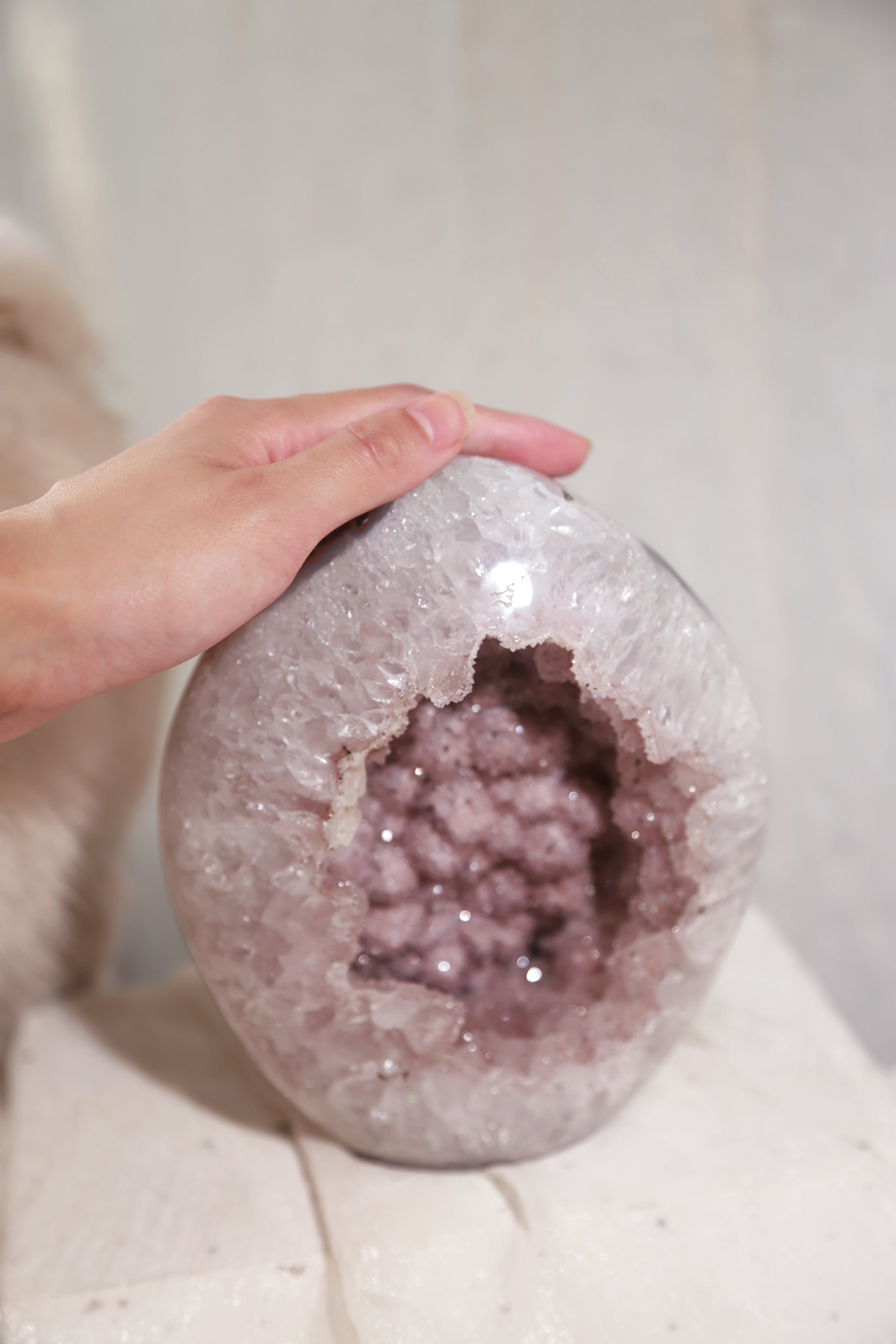 A beautiful Large Rainbow Amethyst Polished freeform, features a really sparkly pink sugar druzy geode. "Sugar druzy" is a descriptive term for a type of druzy (a layer of tiny, glittering crystals on a rock surface) where the crystals are very fine and resemble grains of sugar. Its formation is a secondary process in which mineral-rich water seeps into cavities or cracks in a host rock, and the subsequent evaporation or cooling of this water leaves behind the microscopic crystals.