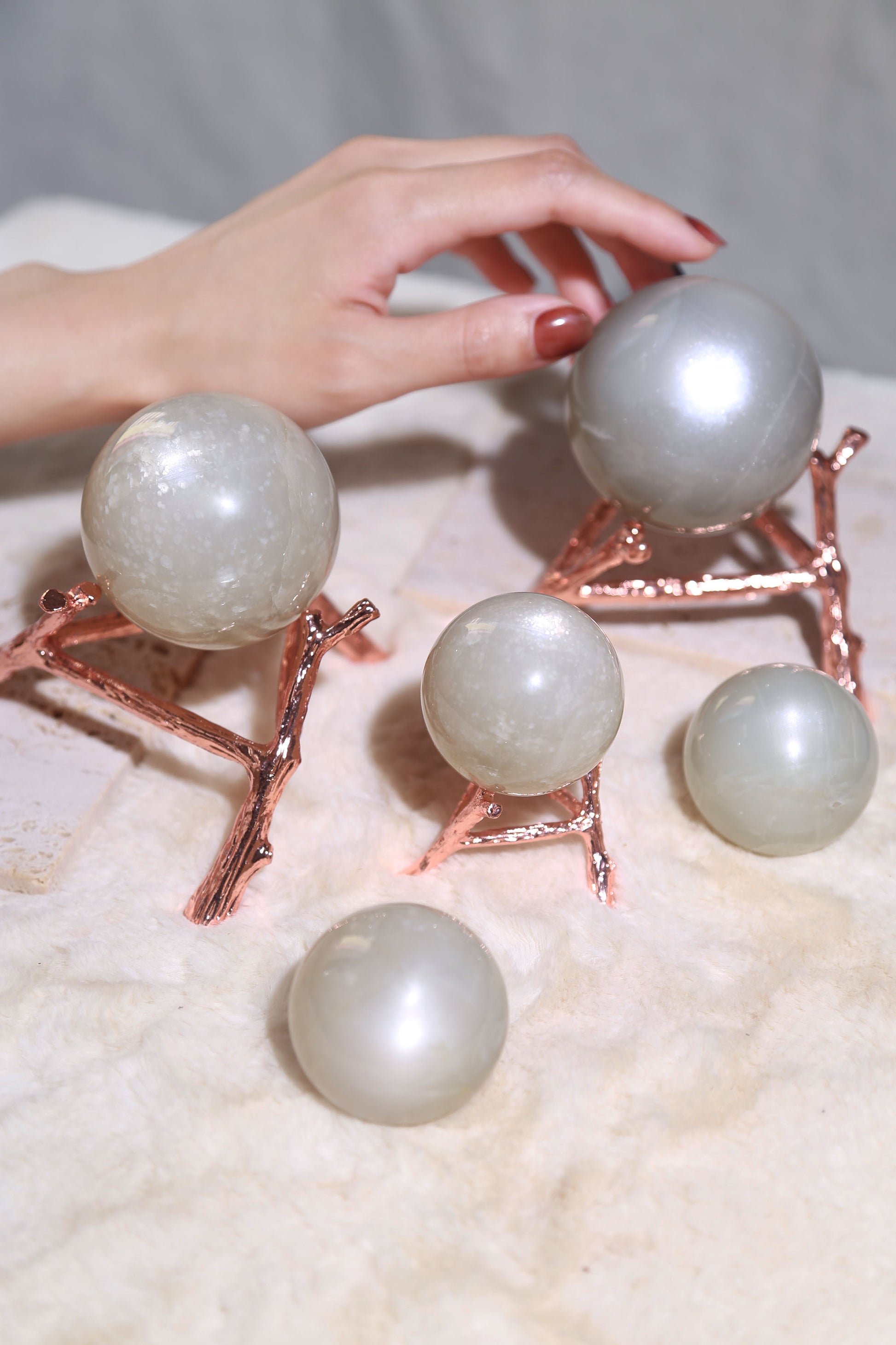A new find of a type of feldspar in the shade of silvery white with blinding silver flash, found in the same cave that produces Sage Moonstones. These matrix of Sunstone and Moonstone spheres are rare interms of the earthy shade with both silky flash from moonstone and glittery reflection from mica.
