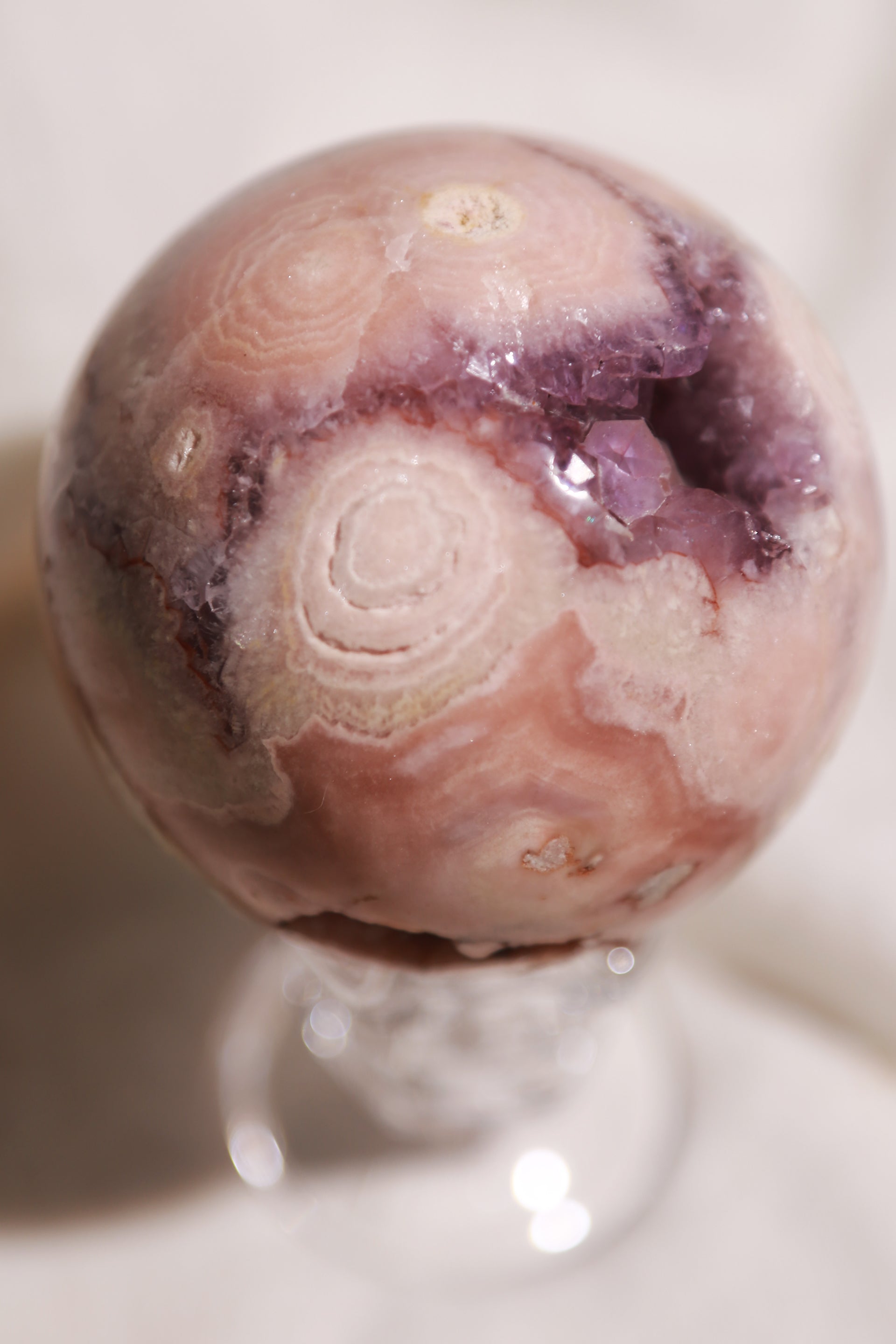 550g 76mm Pink agate sphere with purple druzy geode and floral patterns.