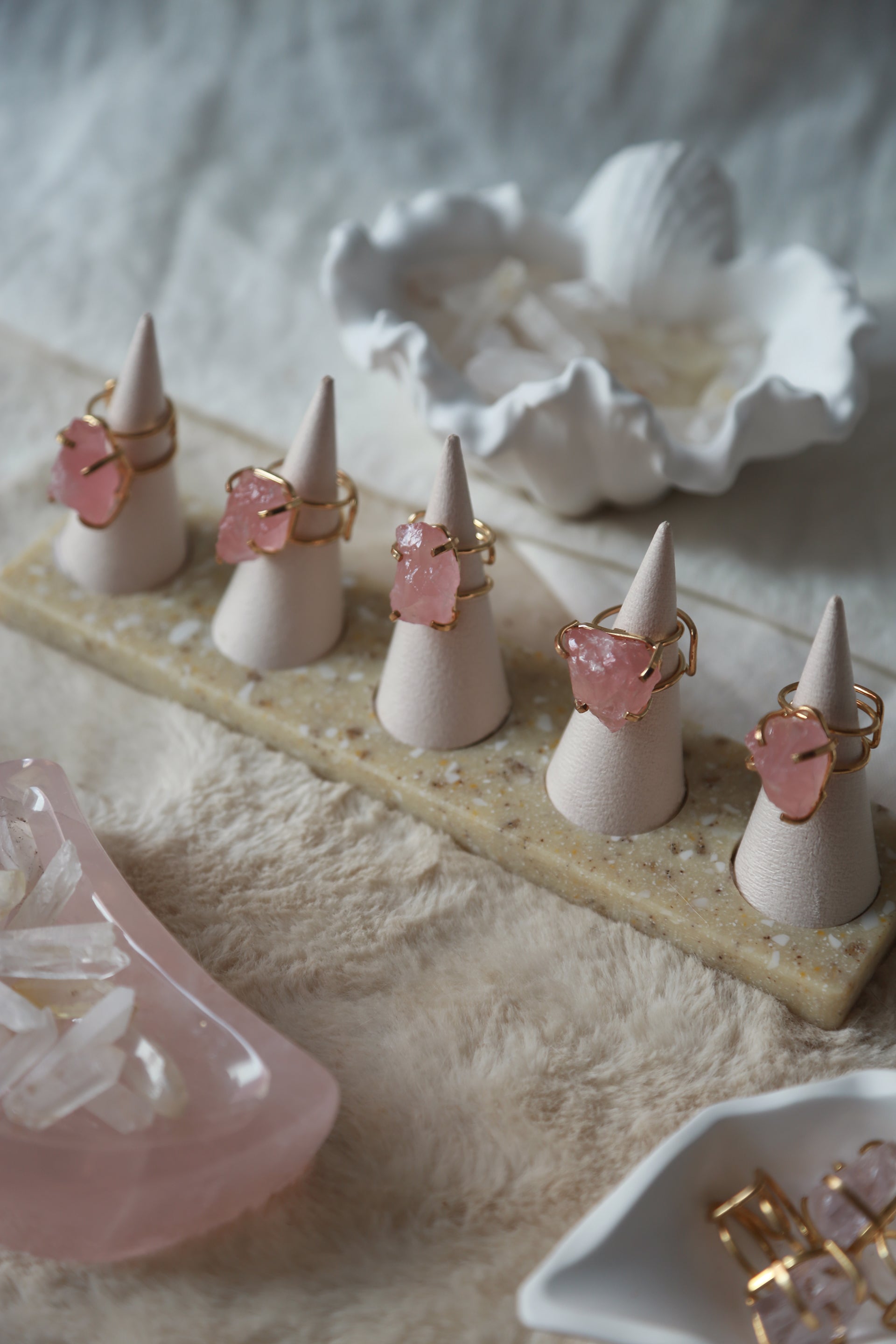 18k gold pleated bronze adjustable wire ring with Rose Quartz Raw Stone. Mined and made in Brazil. You will receive one ring per unit from the album, picked intuitively.